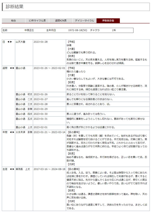 マヤ暦から計算された毎日のKINに対応する卦とコメントを表示しています。このままでマヤ暦を使用したデイリー占いを行うことが可能です。